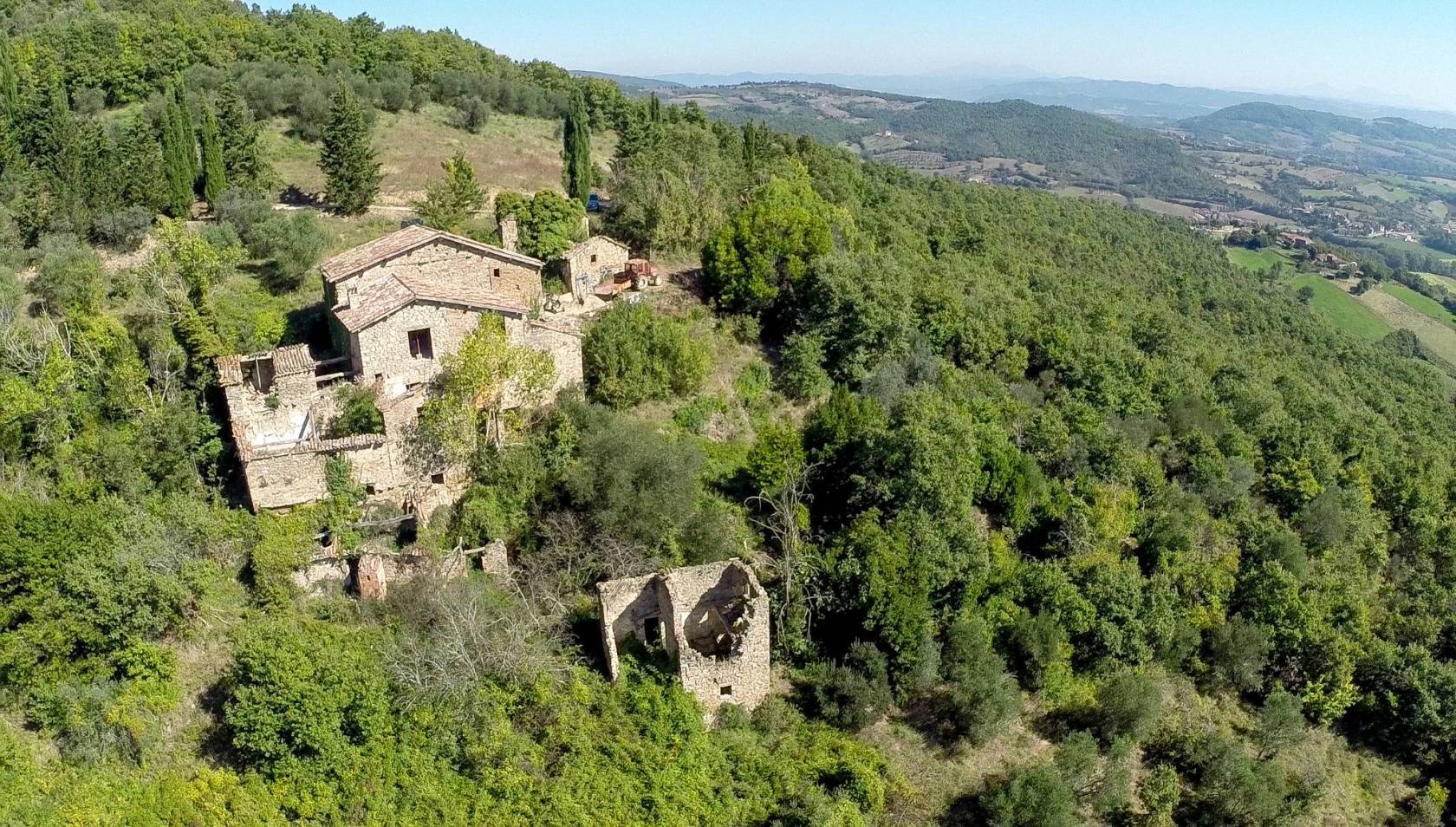 In Umbria, quasi ai confini con la Toscana, in posizione collinare e molto panoramica, troviamo questo agglomerato rurale-Si tratta di un bellissimo borgo arroccato sulla collina, la struttura tutta in pietra tutta movimentata gli conferisce l'aspetto del piccolo villaggio e tutto è addolcito dal paesaggio naturale in cui si trova. La costruzione irregolare del complesso si è formata nel tempo a seguito di edifici aggiunti negli anni in base alle esigenze familiari.